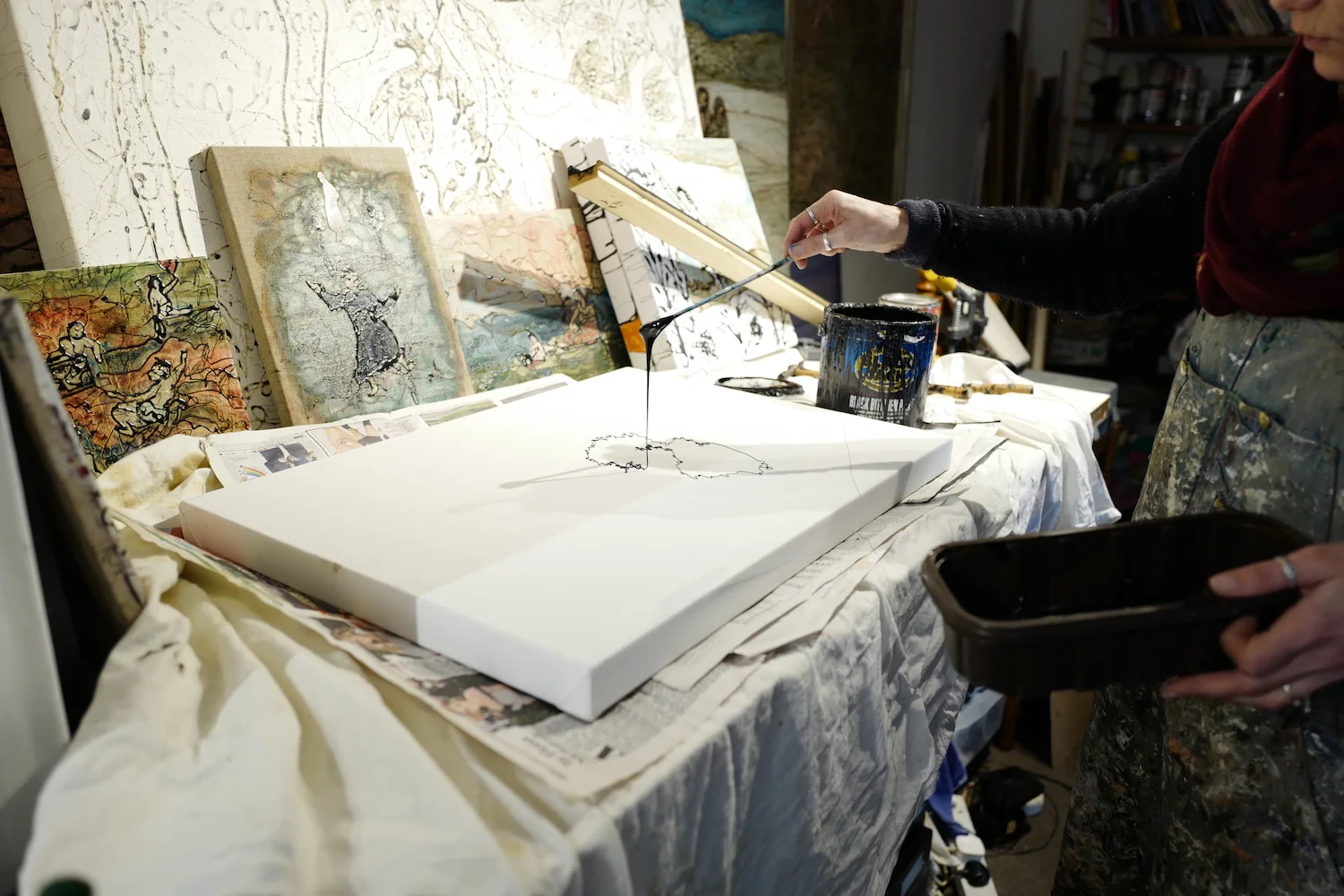 All well established painters have styles. “I’m not entirely sure I have a definable style” Delpha said. What I found interesting when I visited Delpha was her use of bitumen. I guess you’d generally associate bitumen with road repairs. Well I would as I can’t say I’ve ever heard or seen it used in painting before. However, watching Delpha create her artwork with the black sticky stuff certainly added another aspect to the finished article. She dipped her brush into a hot molten pot of this stuff and dropped it from a height. Hot strings of bitumen fell onto her canvas as she moved her brush around. Very visual indeed and a finished article that looked very unique indeed. The air that morning did smell a little different to the normal paint aromas you’d expect.