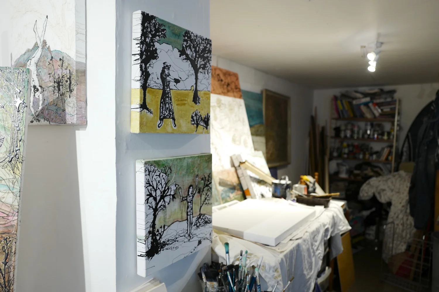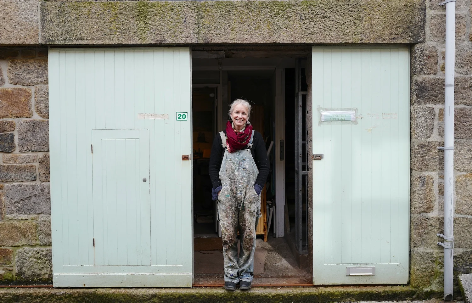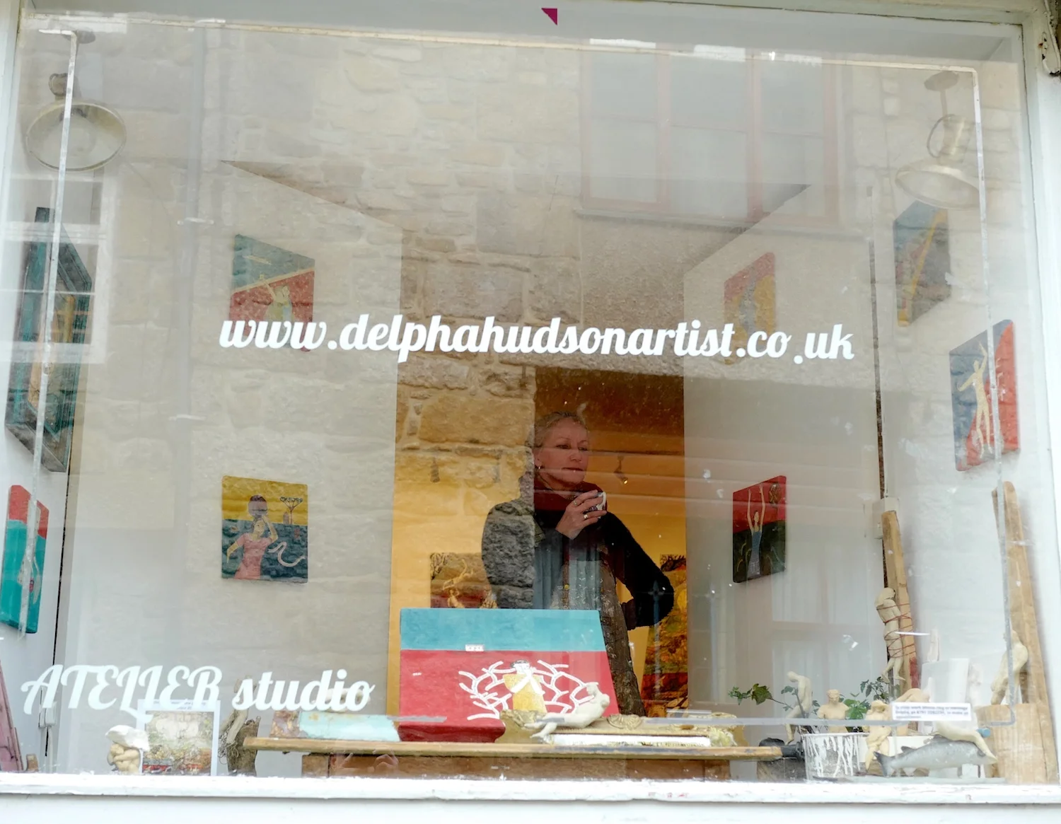 Delpha’s studio is located in a small side street in Penzance. A street I’ve walked up and down many times and often wondered what was behind the large wooden doors. The day I visited her I finally found out what was behind those pale blue doors. There are numerous artists studios in and around Cornwall with fancy facades, plate glass windows and expensive price tags attached. Delpha’s studio was far from that. Just how I’d expected to find it. Paintings everywhere, canvas’s stacked and work surfaces covered in all type of brushes and paint. A real artists studio.