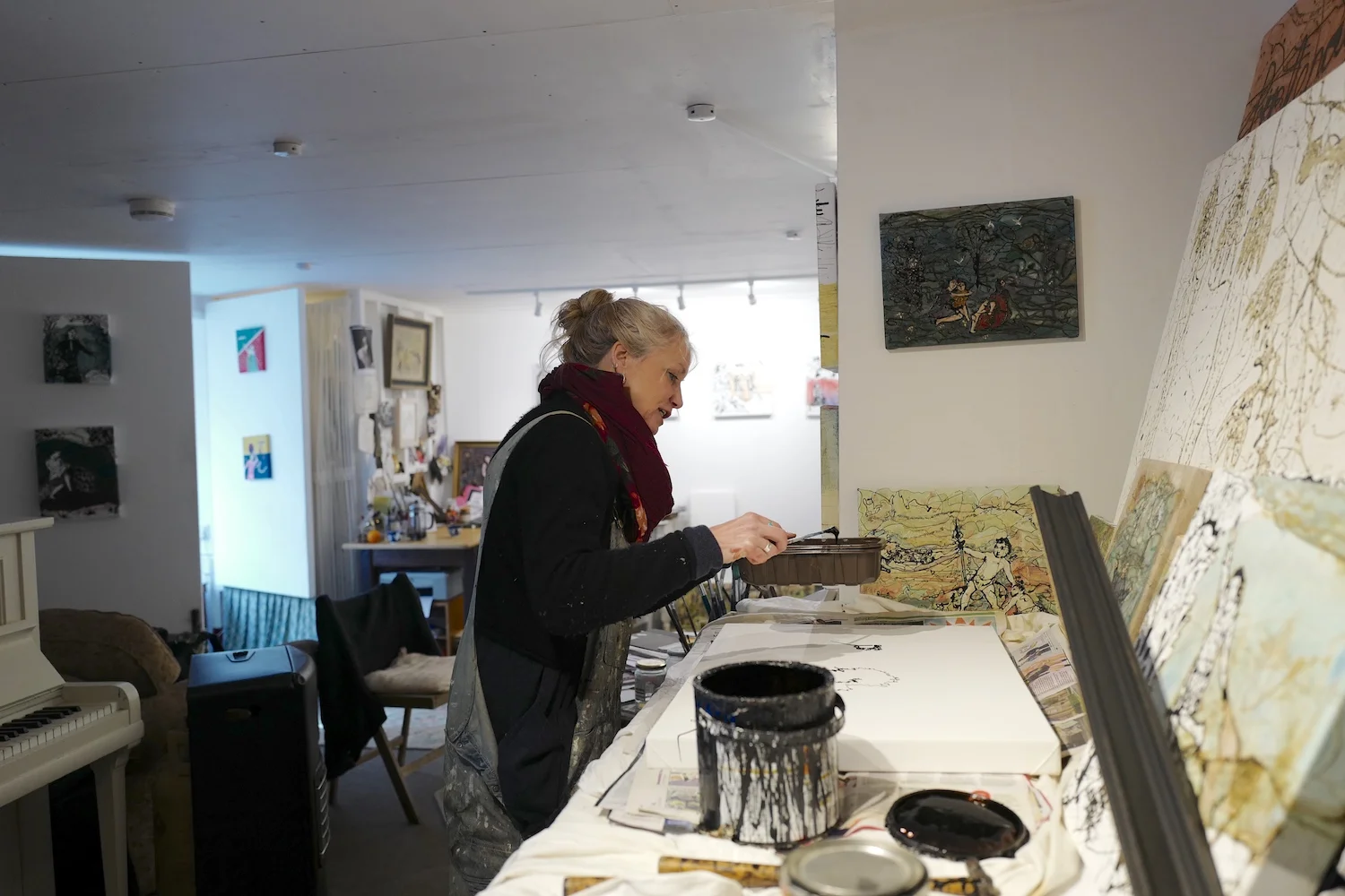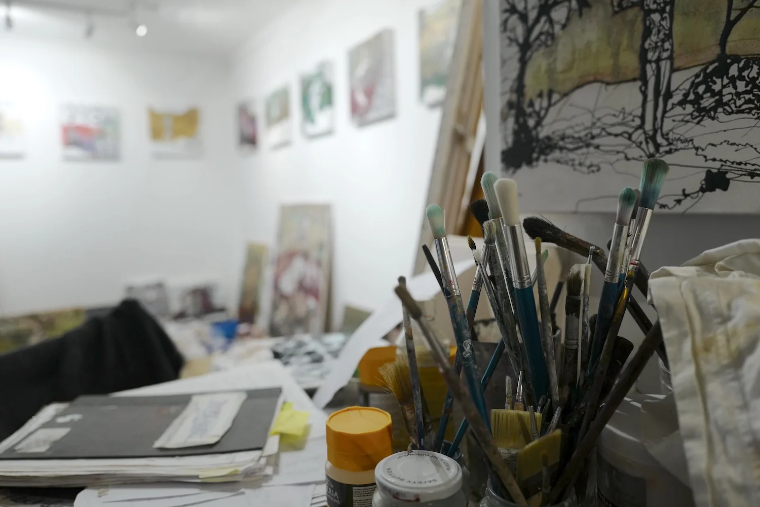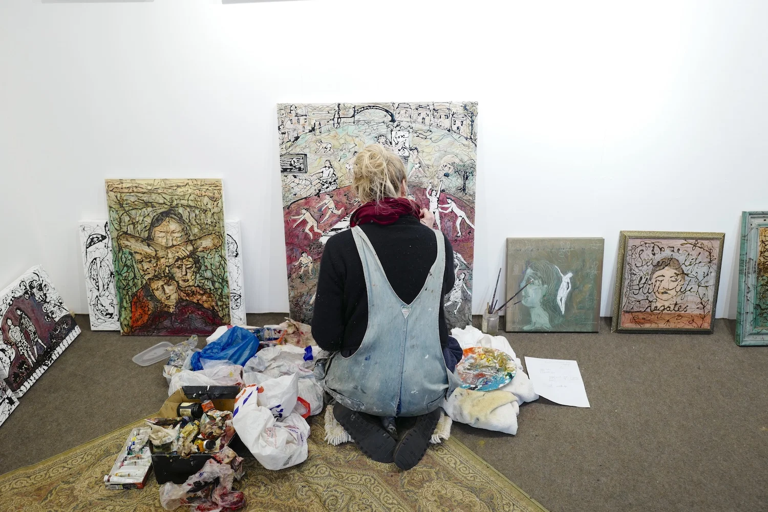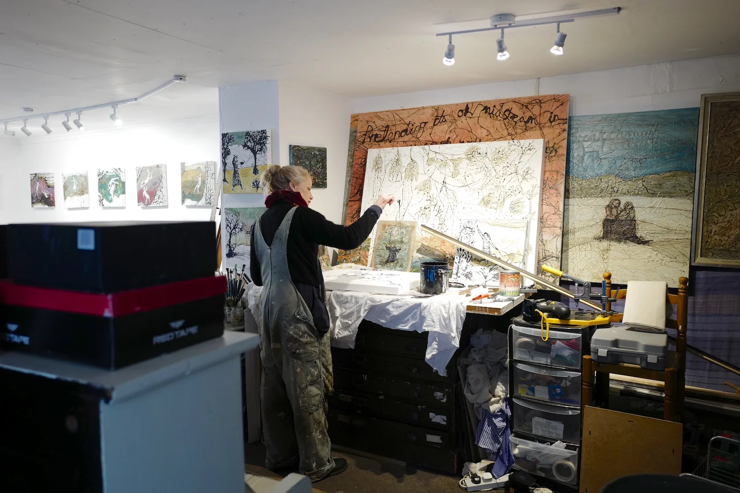 Delpha’s studio is located in a small side street in Penzance. A street I’ve walked up and down many times and often wondered what was behind the large wooden doors. The day I visited her I finally found out what was behind those pale blue doors. There are numerous artists studios in and around Cornwall with fancy facades, plate glass windows and expensive price tags attached. Delpha’s studio was far from that. Just how I’d expected to find it. Paintings everywhere, canvas’s stacked and work surfaces covered in all type of brushes and paint. A real artists studio.